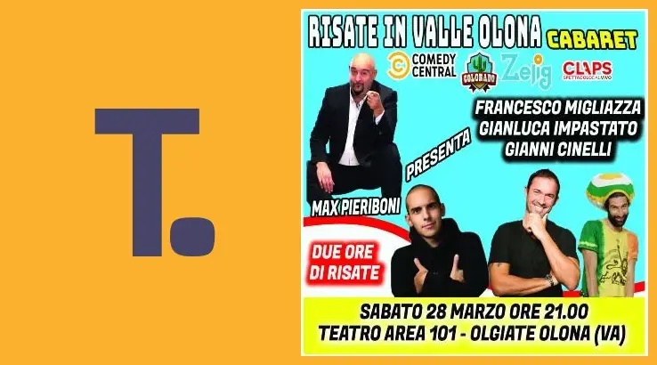 Nuova data di Cabaret - Obbiettivo Risata al Teatro Area 101 di Olgiate Olona. Grande cast da Zelig e Colorado: Gianluca Impastato, Giovanni Cinelli, Francesco Migliazza. Conduce Max Pieriboni.